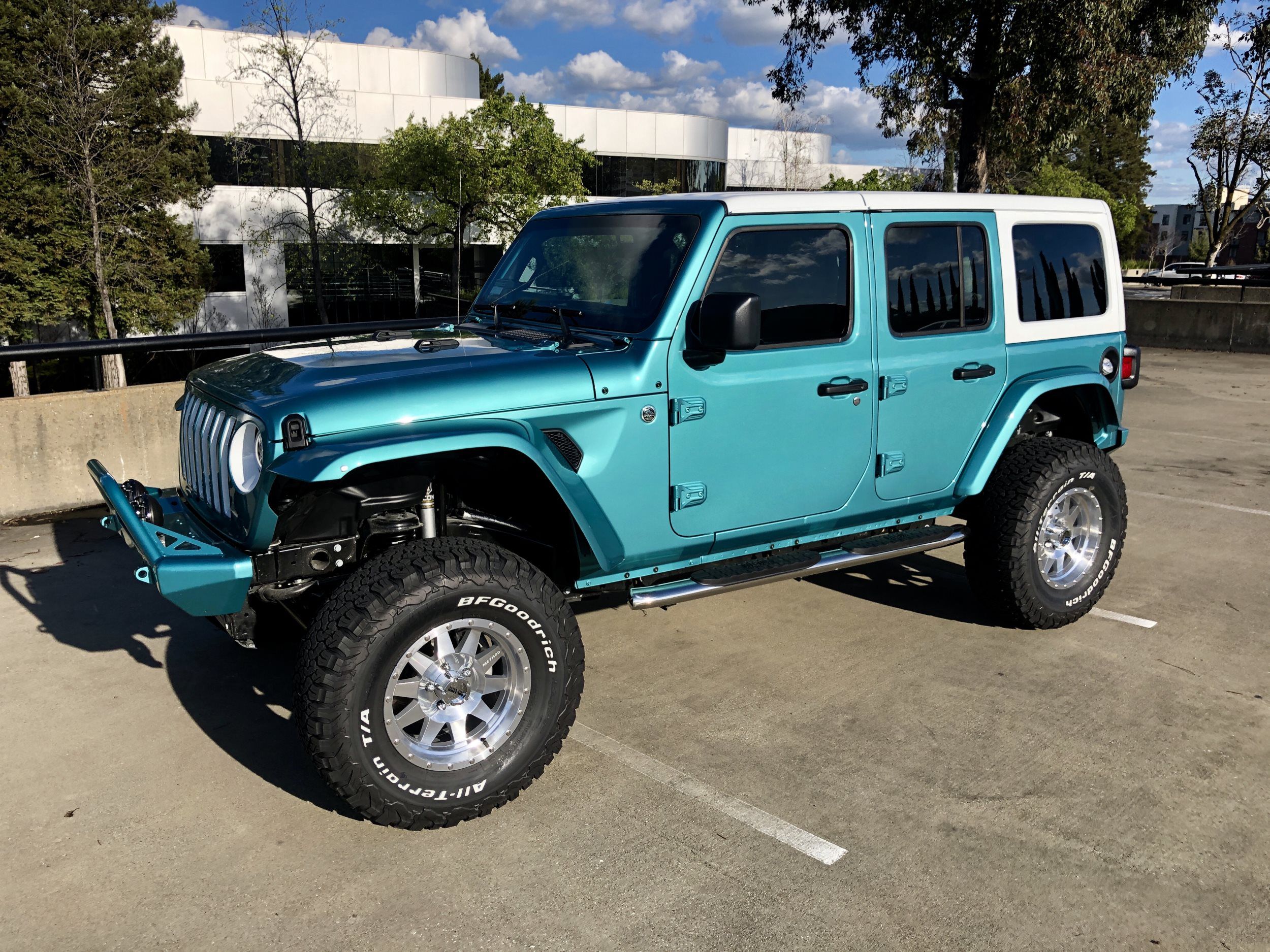 Project Rip Curl: 2019 Wrangler JL Transformation. We were so excited to do this one of a kind build. Client wanted a color that no other Jeep would have and wanted a retro throwback style. We loved the metallic teal and paired it with a white top. A custom white and teal interior was put together with a rockin sound system, new 8” display, custom lighting and dash accents. On the exterior we went with ICON Suspension, Poison Spyder bumpers, high cut fenders, Method wheels, BFG Tires and led lighting. Look for this rig to be hitting a beach near you.
